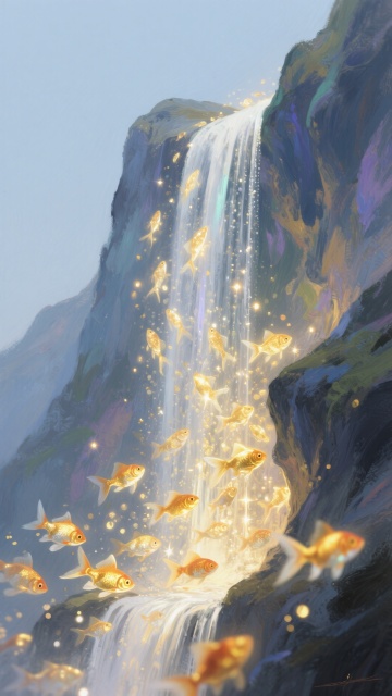 达利抽象画风,一个水池里的水龙头,水龙头中涌出成千上万只发光的金鱼,形成一道金鱼瀑布。魔法现实主义,奇幻风,体积光,高对比度,锐利对焦,纯色背景