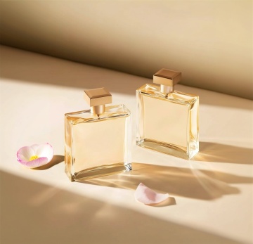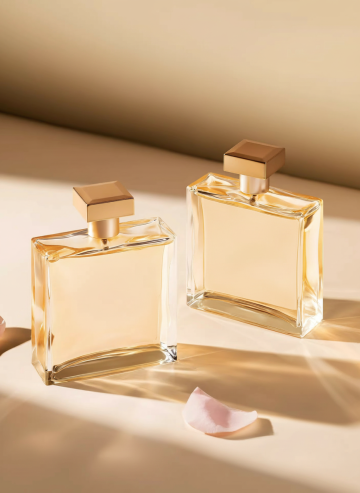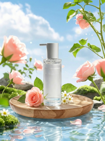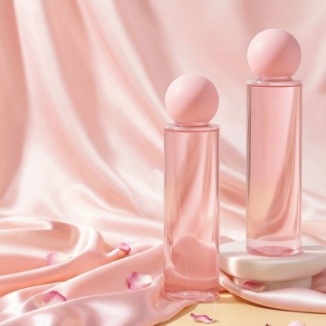高清摄影风格,透明玻璃香水瓶,瓶身呈方形略带弧度,内装淡粉色液体,银色金属喷头与圆形透明瓶盖,瓶身置于柔和褶皱的浅粉色丝质布料上,布料上散落着几朵白色盛开的花朵,背景为渐变的浅蓝色调,带有柔和的光线斜射形成的光斑和阴影,整体营造出清新、优雅、浪漫的氛围,光线明亮柔和,突出香水瓶的透明质感与液体的色泽,画面构图简洁,主体清晰,细节丰富,具有高端香水广告的精致感与视觉吸引力。