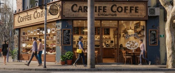 3D风咖啡店,金属与塑料质感结合,未来感十足,卡通化设计,城市背景凸显潮流与科技感。