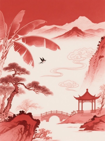 蕉红色纯色背景,绛红色中国传统水墨风格山水画,包含远山、青松、仙鹤、祥云、小桥、亭台等国风元素,线条流畅简洁,水墨晕染效果自然,画面空灵雅致,富有东方意境