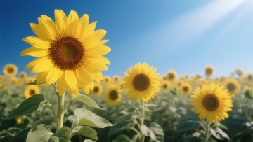 一片向日葵花田,画面以写实风格呈现,主色调为明亮的黄色和深邃的蓝色,阳光明媚,光线从上方照射下来,形成清晰的光影效果,向日葵的花瓣质感细腻,花蕊呈棕色,充满生机与活力。