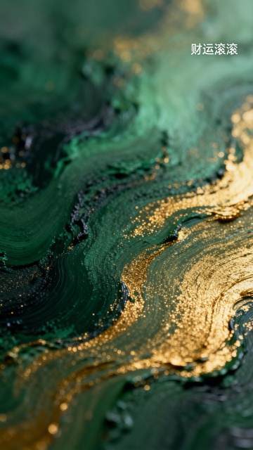 墨绿金色弥散背景,带有颗粒感和油彩质感,抽象艺术风格,特写镜头,梦幻氛围,质感丰富,右上角竖排小字“财运滚滚”