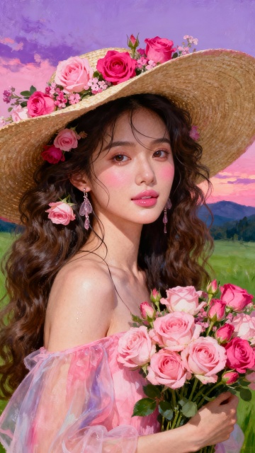 梦幻感与浪漫交织的插画风油画,厚涂技法呈现柔美质感,少女手持玫瑰花束,置身虚拟自然中,唯美清新,如诗如画。