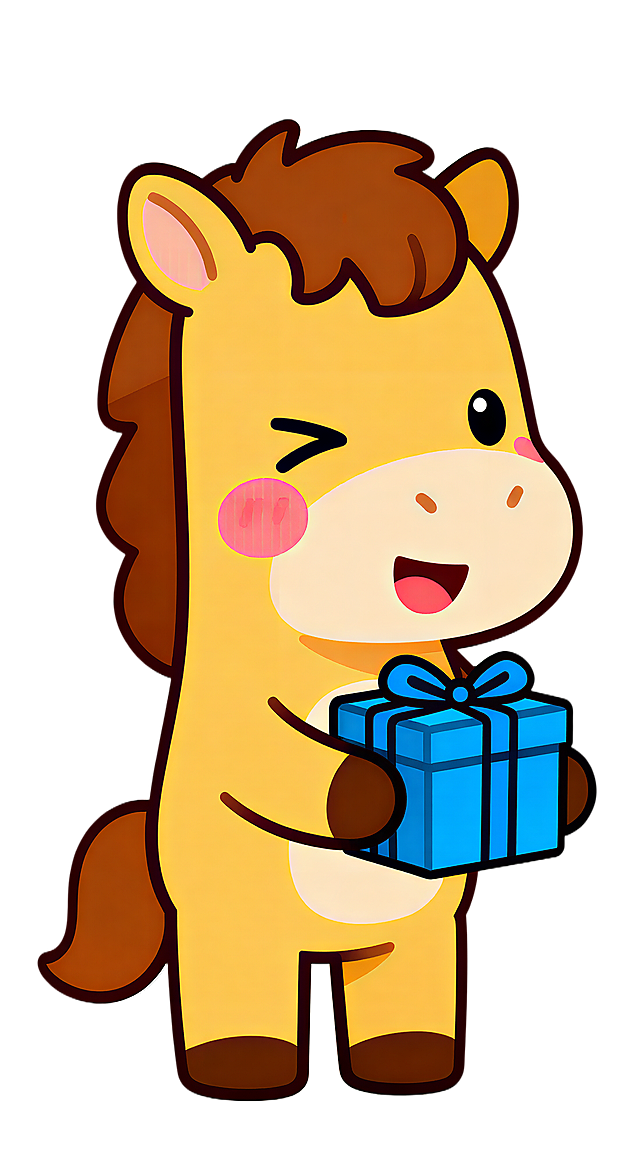 一只棕黄配色的萌系 Q 版扁平小马,带着腮红、wink 表情,双手抱着红色礼盒,朝左,手绘风格,没有描边效果,背景为纯白色。详情