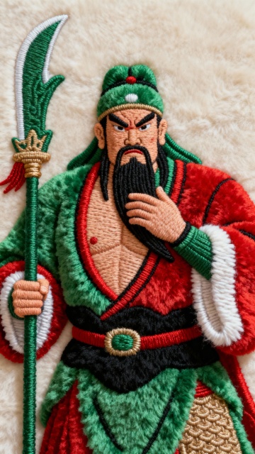软3D风中式卡通人物,手持青龙偃月刀,色彩鲜艳,节日氛围浓厚。