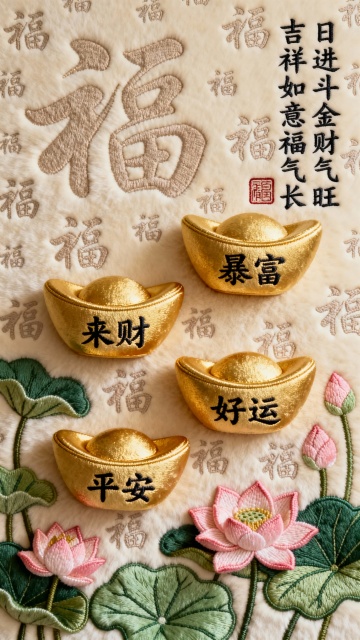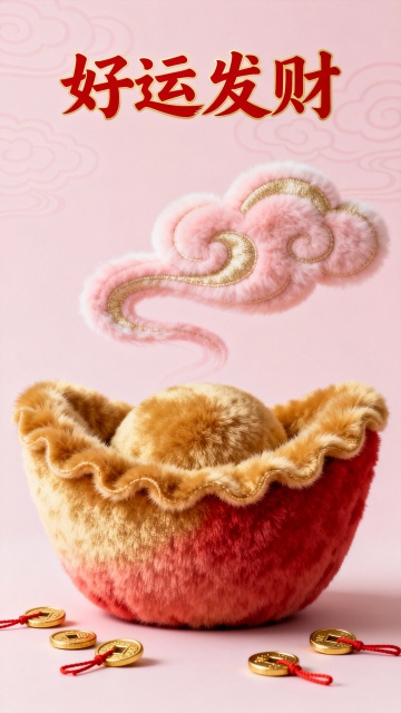 国风简约喜庆风,主体为超大号毛绒元宝(金红渐变,绒毛柔软蓬松,边缘微卷),元宝上方有毛绒祥云(浅粉 + 浅金)飘绕,下方散落 3-5 枚小巧毛绒铜钱(金色,带红绳装饰);背景为淡粉色国风暗纹(极简祥云纹),干净清爽;画面顶部居中是国风毛笔字 “好运发财”(红色描金,字体饱满);整体色彩柔和不刺眼,毛绒质感细腻,构图简洁大气,高清晰度,适配手机全屏显示。