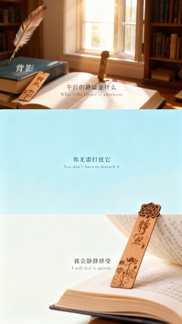 横向三宫格艺术感写真图,场景为午后的书房,色调为浅蓝与米白渐变。第一张图(近景):复古木质书签置于书本“背影”上,旁有羽毛笔,居中字幕“午后的静谧是什么”“What's the silence of afternoon”;第二张图(中景):书签夹在书页间,阳光透过窗户洒下,居中字幕“你无需打扰它”“You don't have to disturb it”;第三张图(特写):书签上的细腻雕花,书页微微翻动,居中字幕“我会静静感受”“I will feel it quietly”。整体氛围宁静舒缓,光线柔和,细节清晰,突出书签主体。