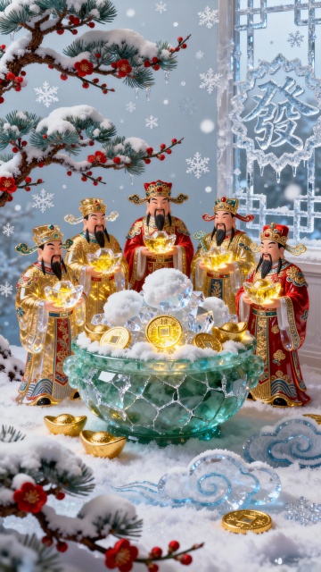 国潮风格,五路财神立于覆雪的青松与红梅枝头,祥云化为冰晶云。财神金身采用半透明的琉璃与珐琅质感,内部有金光流动。金币为冰晶与黄金的融合体,核心发光,表面有冰裂纹理。巨大的聚宝盆由翡翠雕刻而成,堆满雪团与金元宝。背景是飘落的雪花和冰冻的“發”字窗花。色彩以暖金、朱红与冰蓝对比,8K分辨率,既清冷又奢华。