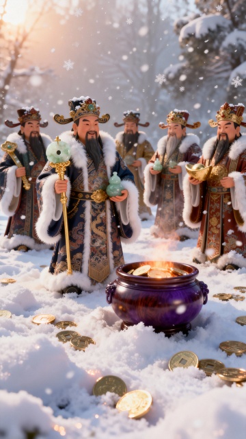 电影级光影,超写实3D渲染,五路财神在漫天绒雪中降临。财神官袍为厚重织锦并镶有白色毛绒镶边,法器为温润的和田玉与黄金打造。金币散落在蓬松的雪地上,部分被雪半掩,反射暖光。聚宝盆为紫檀木材质,冒着温热的气息。使用柔和的逆光,突出毛绒、玉石、白雪的不同质感,营造冬日里的温暖与神圣。
