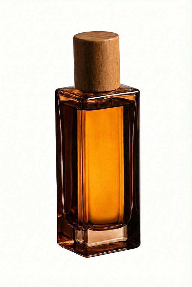一瓶精致的香水,瓶身设计优雅,透明玻璃材质,带有金属质感的瓶盖,放置在纯色背景上,光线柔和,突出香水的高端质感和精致细节详情