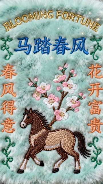 刺绣风融合工笔细腻,拟人小马拉车送喜,樱花纷飞中仙鹤衔爱,满载童趣与祝福,传递温馨梦幻的节日喜悦。