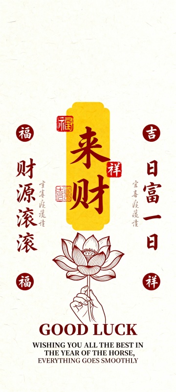米色纸质感背景,最上方有英文“GOOD LUCKY”,中间是东方符箓字体的“马上暴富”,文字灵感源于道家神秘灵符笔画,融合玄术封印、夸张笔触、咒语结构线条与马的抽象形象,排布对称神秘,采用金墨渲染并搭配红色和蓝色,四周环绕装饰性英文“Happy New Year”、“Money Magnet”、“Compound Your Success”,整体呈现古东方玄学风,兼具神秘与现代简洁氛围,细节丰富修饰