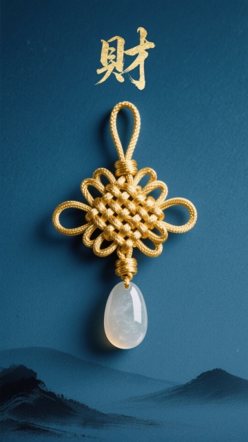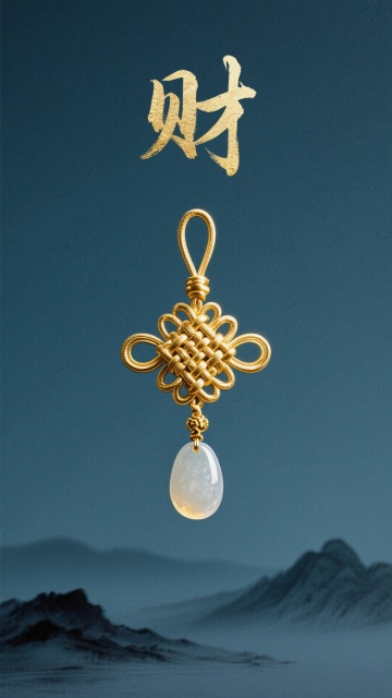 中式古典风,鎏金中国结配玉坠,水墨山水背景,国潮重拟物设计,尽显奢华与优雅,寓意财源滚滚。