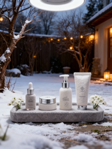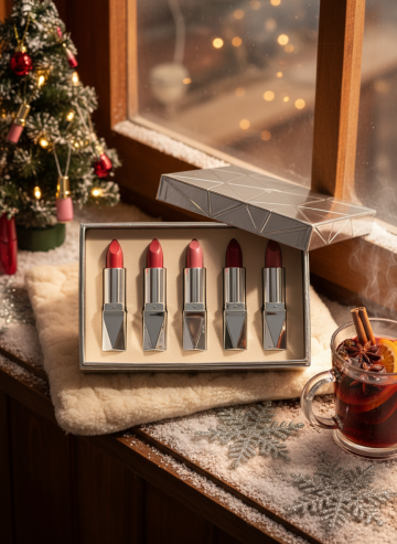 3D重拟物风格,柔和粉调营造甜美舒适感,金属质感唇膏与塑料风礼盒交织,节日氛围浪漫精致。