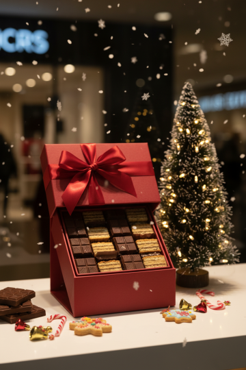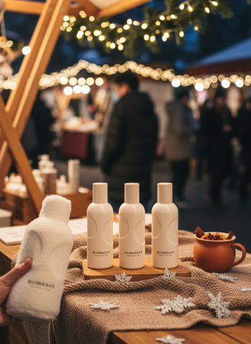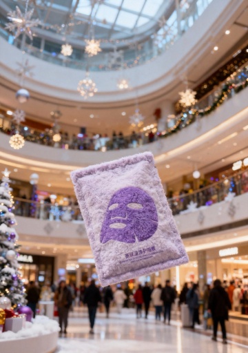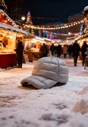 将图示商品变成充气羽绒质感,还原商品颜色、文字、图案细节。冬日步行街商品橱窗场景