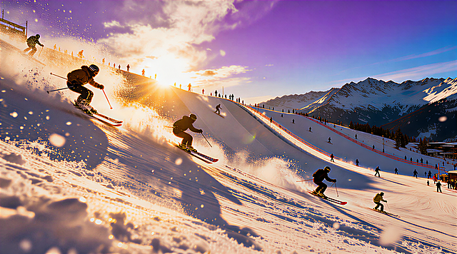 这是一个动画片的开幕照片,用于生成视频,图片是个大型滑雪场的场景滑雪者纷纷秀着各自的滑雪技能。要求场面震撼,滑板溅起的雪飞扬,要有电影级的光效,大片的既视感。详情