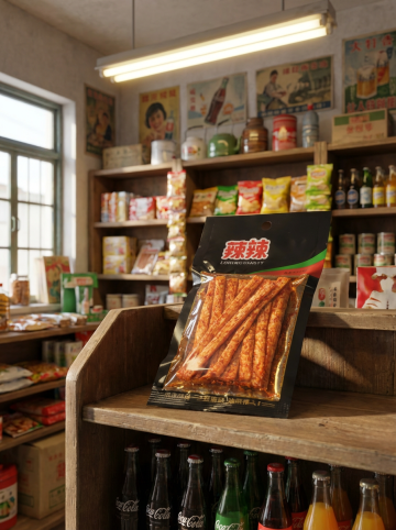 复古感怀旧杂货铺,质朴木质货架陈列,东亚风印刷海报点缀,重拟物包装突显辣辣零食质感,实景光影营造年代氛围。