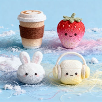 软3D风毛线编织物,拟人化草莓、咖啡杯与兔子耳机,梦幻清新配色,刺绣质感细节,营造冬日温暖治愈氛围。