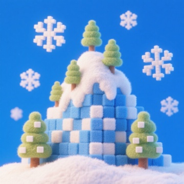 刺绣风插画,蓝调雪景温馨治愈,轻拟物树木与小屋,面料质感细腻,雪花飘落,冬日清新感十足。