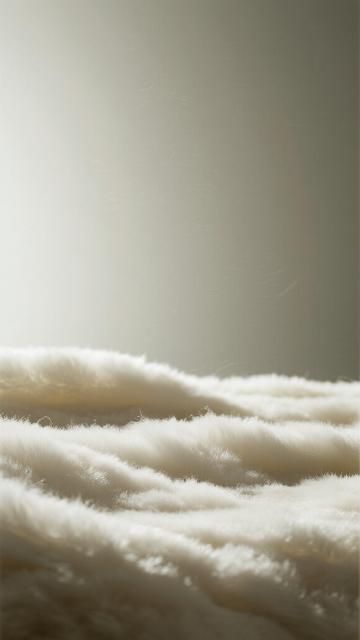 一张高质感的地毯特写,整体呈现纯净的白色调,光线柔和均匀地洒落在表面,营造出明亮、洁净的氛围。地毯表面材质改为光滑细腻、纹理清晰的羊毛,保留原有的大面积覆盖构图和自然的褶皱起伏感,羊毛纤维紧密且带有细微的自然光泽,展现出柔软而富有弹性的质感,整体视觉效果保持与原图一致的简约、高级感。