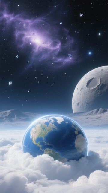 浩瀚深邃的太空背景,深邃的深蓝色宇宙中点缀着无数闪烁的白色星辰,星云呈现出缥缈的蓝白色光带。前景是崎岖不平的灰白色星球表面,布满巨大的岩石和陨石坑。中景偏左位置有一颗巨大的蓝绿色行星,表面有明显的纹理和光晕,其右下方有一颗较小的同色系行星。两颗行星周围漂浮着细小的岩石碎片。整体画面采用写实风格,光影效果强烈,行星表面有清晰的高光和阴影过渡,营造出神秘而壮丽的宇宙氛围,色彩以蓝、白、灰为主,色调统一和谐,具有极强的视觉冲击力和空间纵深感。