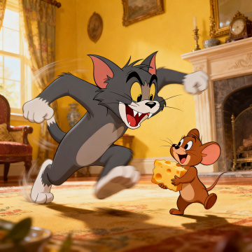 Tom猫和Jerry鼠从一张破旧的报纸破洞中探出身形