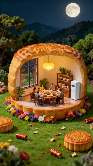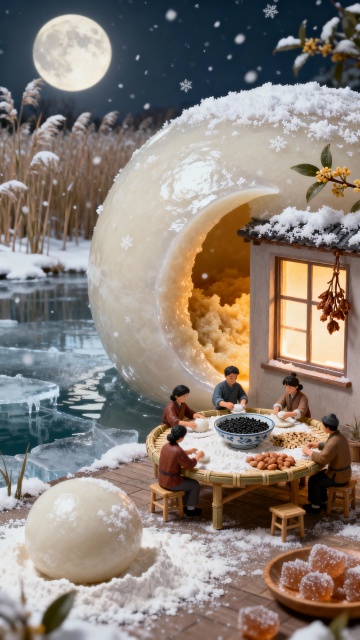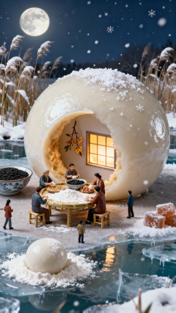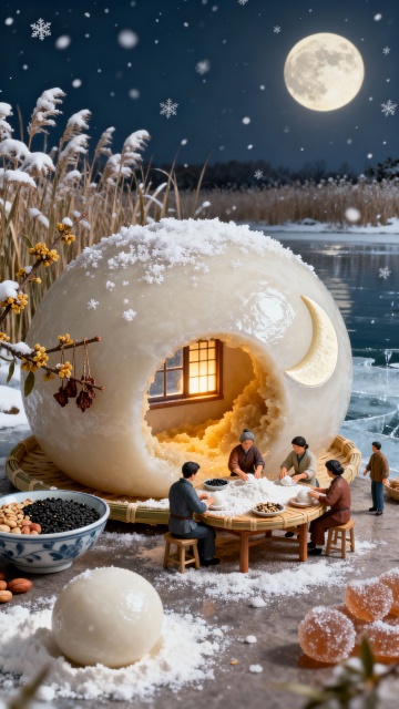 微缩艺术风雪夜月圆,粘土质感的汤圆屋内暖光盈盈,重拟物手法呈现温馨团圆场景,超现实主义构图融合梦幻光影,讲述冬日温情故事。