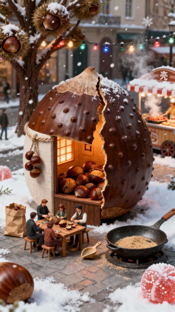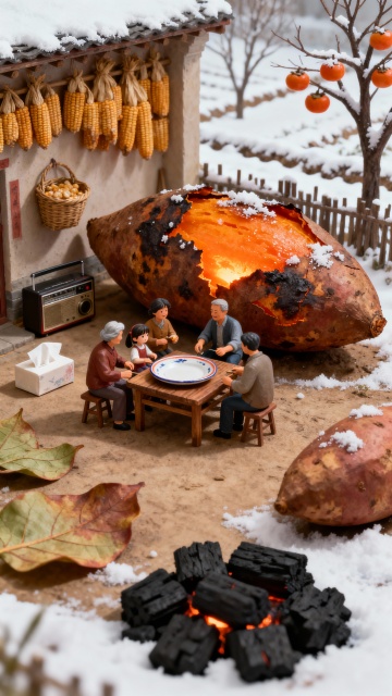 主视觉:带焦褐色纹理的巨型烤红薯,外皮有自然开裂的纹路,“裂口” 处透出暖橙光,仿佛能闻到焦香。 内部场景:暖光模拟红薯果肉的温度,一家人四世同堂围坐矮木桌分享红薯,桌上放着搪瓷盘与纸巾盒,墙面挂着编织筐,里面堆着晒干的玉米芯,角落有台老式收音机。 外部环境:空间外是覆雪的田埂,地面散落巨型红薯叶、炭块造型装饰,背景是光秃秃的柿子树与亮着暖光的农家院,雪花落在红薯 “外皮” 上,很快被暖意烘化。