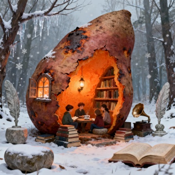 雪林深处,巨蛋屋内暖光氤氲,四人围坐共读,书卷与留声机点缀梦幻。插画风融合厚涂与微缩艺术,超现实主义构图传递温馨故事感,如油画般温暖动人。
