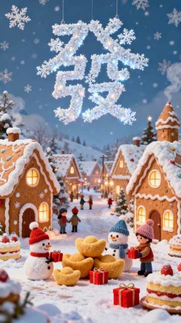 3D微缩艺术风雪夜小镇,粘土质感卡通人物与发光“發”字雪花装饰,融合圣诞温馨与新年喜庆,拟人化雪人送礼,毛发生长般细腻纹理,梦幻又可爱。