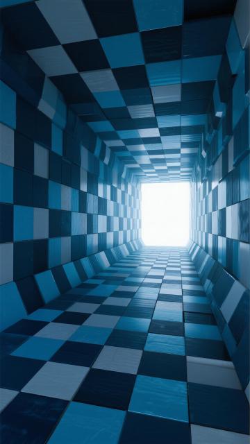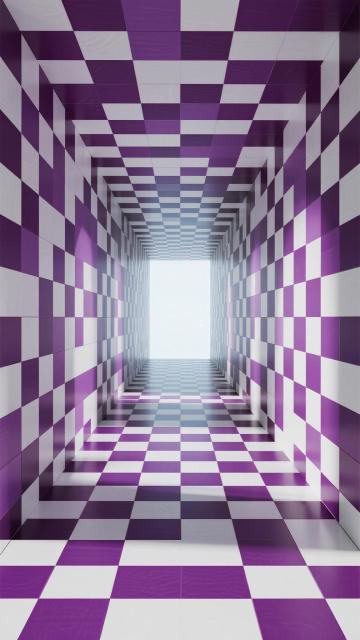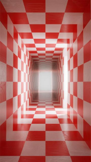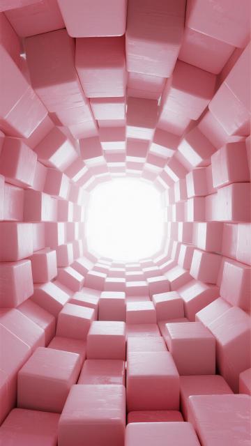 3D渲染风格的无限延伸隧道,由大小均匀的正方形格子铺成的地面、墙面和天花板,呈现强烈的透视感和空间纵深感,尽头有明亮的光源营造出神秘而通透的氛围,整体光影效果柔和,格子边缘清晰锐利,具有光滑的材质质感和微妙的反光,将原有的蓝白配色方案改为粉白配色,粉色采用从浅粉到深粉的渐变层次,白色保持纯净明亮,使整个空间呈现出柔和浪漫的视觉感受,构图采用中心对称式,引导视线向隧道深处延伸。
