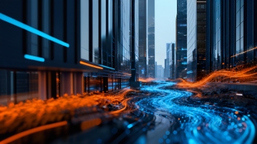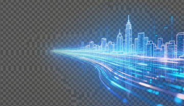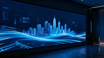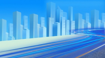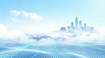蓝色渐变背景,城市剪影与抽象线条融合,简约现代风格,科技感波浪纹理,几何图形装饰,明亮光斑点缀,政务宣传海报设计,简洁大气,视觉层级清晰,突出城市发展主题,无文字信息