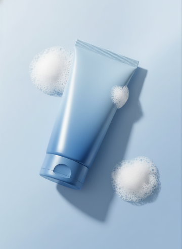 3D轻拟物风格,蓝调渐变瓶身搭配细腻泡沫,清透柔和,营造清爽舒适感,视觉洁净如晨露。