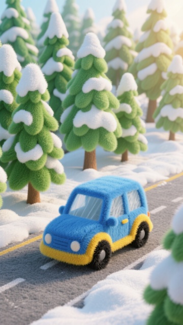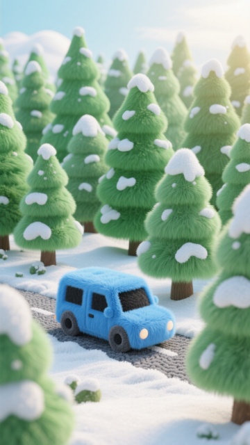 毛绒质感的蓝色小车穿行于雪覆松林,软3D风格融合粘土风与毛发生长效果,营造出梦幻温馨的冬日童话场景。