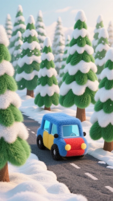 毛绒质感的3D卡通雪景,萌趣小车穿行于梦幻雪松间,温暖色调营造冬日温馨氛围,充满童趣与节日气息。
