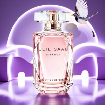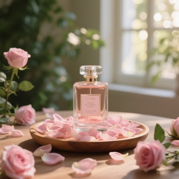 唯美感与浪漫感交织的3D重拟物风香水场景,玻璃瓶身透出柔和光影,玫瑰花瓣环绕,营造清新优雅的实景氛围。