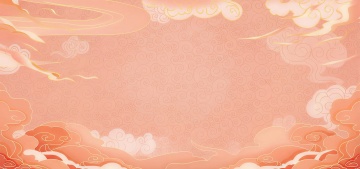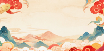 中国传统工笔画风格的纯色背景(米白色),画面四周有金色祥云纹边框,左上角有一个圆形红日,背景是淡灰色的连绵山脉,山间有几只飞鸟,左下角和右上角有金色祥云装饰,整体风格淡雅、清新、富有诗意。