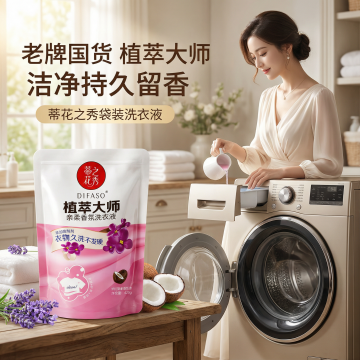 一张洗衣液商品主图。多桶薰衣草洗衣液堆叠在展台上,背景为虚化阳台,柔和紫光。卖点 “薰衣草香 护色洁净”。下方紫绿渐变文本框,展示 “3kg×2 瓶 持久留香 易漂无残留”。