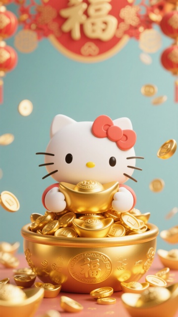 顶部只有背景和装饰,主要内容在画面一半以下,一个kitty猫在中间抱着聚宝盆,元宝喜庆色调,红包、鞭炮等新年元素,简单背景。