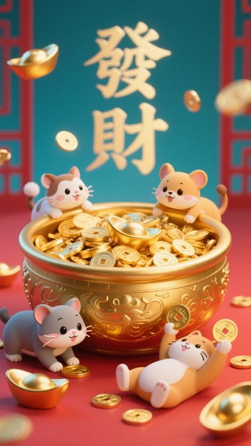 竖着居中写着“恭喜发财",四只小动物趴在旁边,要求金色勾边,聚宝盆金色勾边,还有一个财神搞怪的表情,要求具有时代感,画面背景,少女时代的魔法效果,元宝喜庆色调,简单背景