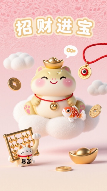软3D风可爱猫咪,毛发生长质感,手持鎏金铜钱,重拟物设计,喜庆卡通感,背景金光闪烁,寓意新年招财纳福。