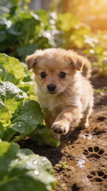 萌趣小狗在晨光菜园中奔跑,水彩质感与毛发生长风交织,光影斑驳,清新自然,实景感十足。