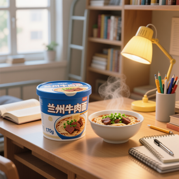 顶视角度,一碗黑色的碗里装着飘香的牛肉面,面条根根分明,汤色浓郁,上面撒着鲜红的辣椒和翠绿的葱花,热气腾腾,散发着诱人的香气,画面清晰,色彩鲜艳,细节丰富