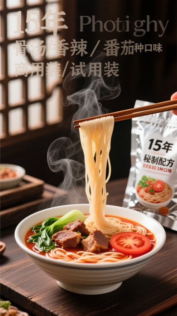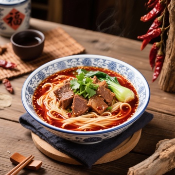 超写实美食摄影风格,一碗热气腾腾的中式面条,深棕色浓郁汤汁,面条被木筷挑起呈现自然垂坠感,碗中点缀大块炖煮至软烂的酱色肉块、翠绿香菜和葱花,碗边散落鲜红完整干辣椒,背景为古朴木质纹理与中式格栅窗的模糊剪影,整体暖色调(棕红、赭石、暖黄为主),侧上方柔和主光源形成明显高光与阴影对比,突出食物质感与立体感,大面积留白处理增强画面呼吸感与简约高级感,木质桌面纹理清晰,整体氛围温暖诱人,细节丰富,色彩和谐统一。