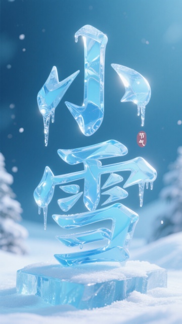 冰晶质感的“小雪”字样,融合3D重拟物与玻璃风设计,清透光影交织,静谧雪境中展现虚拟现实般的冬日诗意。