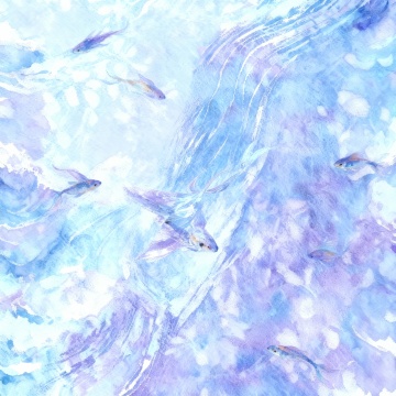 水彩风插画,梦幻清新,虚拟自然景象,鱼群游弋,阳光洒落,营造夏日梦幻氛围。