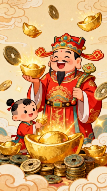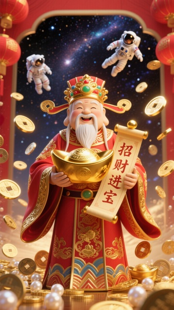 3D重拟物风格,鎏金金属质感,浮雕细节,中式古典喜庆氛围,财神持金元宝与“招财进宝”卷轴,红金配色,祥云、灯笼与牡丹环绕,春节主题。