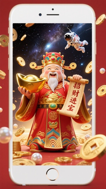 手机壁纸,财神爷,一位慈祥的中国神祇,身穿华丽的红色和金色官袍,头戴官帽,手持大金元宝和“招财进宝”卷轴,周围漂浮着金币、铜钱和珍珠。背景是祥云、灯笼和牡丹花。金色光晕,红色主题,细节丰富,3D渲染,超高清,充满节日气氛,对称构图。