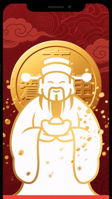 手机壁纸,财神爷,一位慈祥的中国神祇,身穿华丽的红色和金色官袍,头戴官帽,手持大金元宝和“招财进宝”卷轴,周围漂浮着金币、铜钱和珍珠。用星空做背景