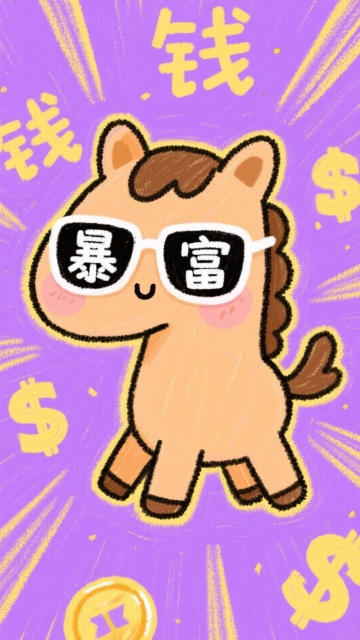 插画风卡通小马戴“暴富”墨镜,蜡笔质感描边,紫色背景配金币与美元符号,喜庆噪点点缀,充满可爱与财运氛围。